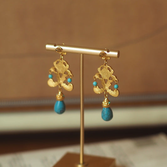 Vintage Palace Style Turquoise Earrings - Handcrafted Floral Carved Drop Earrings
